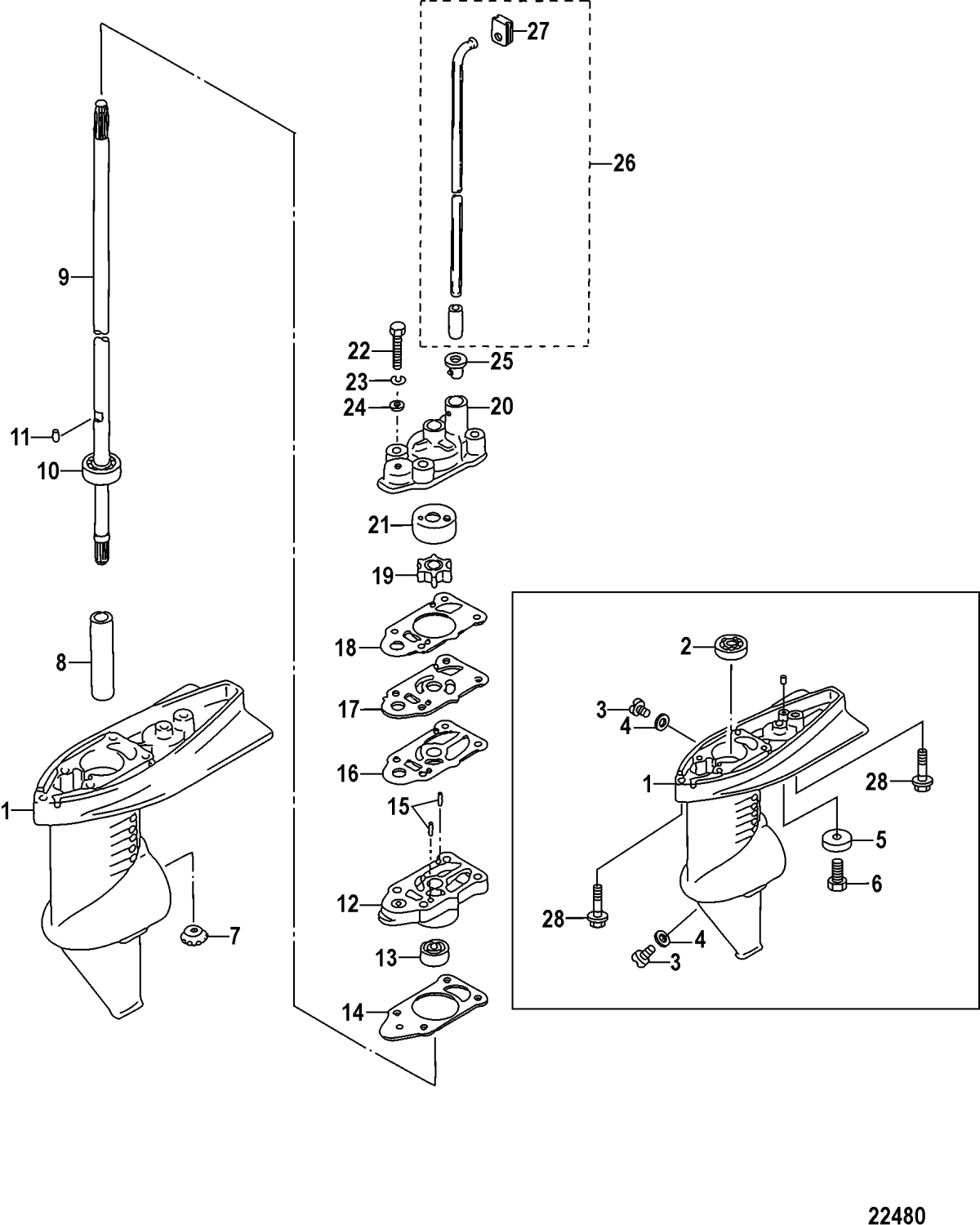 Lager drivaxel Mercury 3,3 hk, 74,5 cc 2-takt samt F 2,5 - F 3,5 hk , 85,5 cc 4-takt Tohatsumodeller