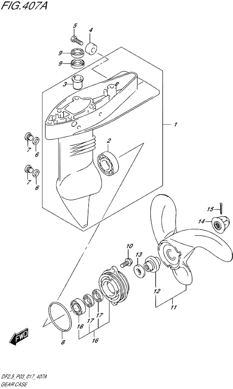 Sitter i propelleraxelns lagerhus, nr 18 i bild 2 visar DF 2,5 hk