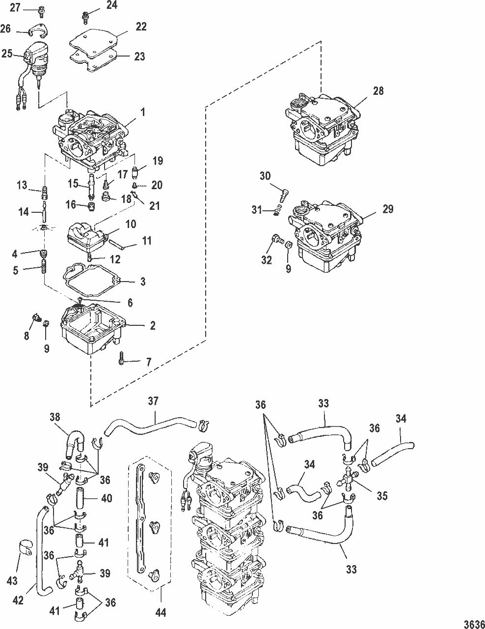 Låspin flottör förgasare Mercury F 15 SeaPro 328 cc och F 25 SeaPro 492 cc nr 11 i bild 2 samt i vapor på F 25 - F 30 hk, 526 cc 4-takt, nr 14 i bild 1