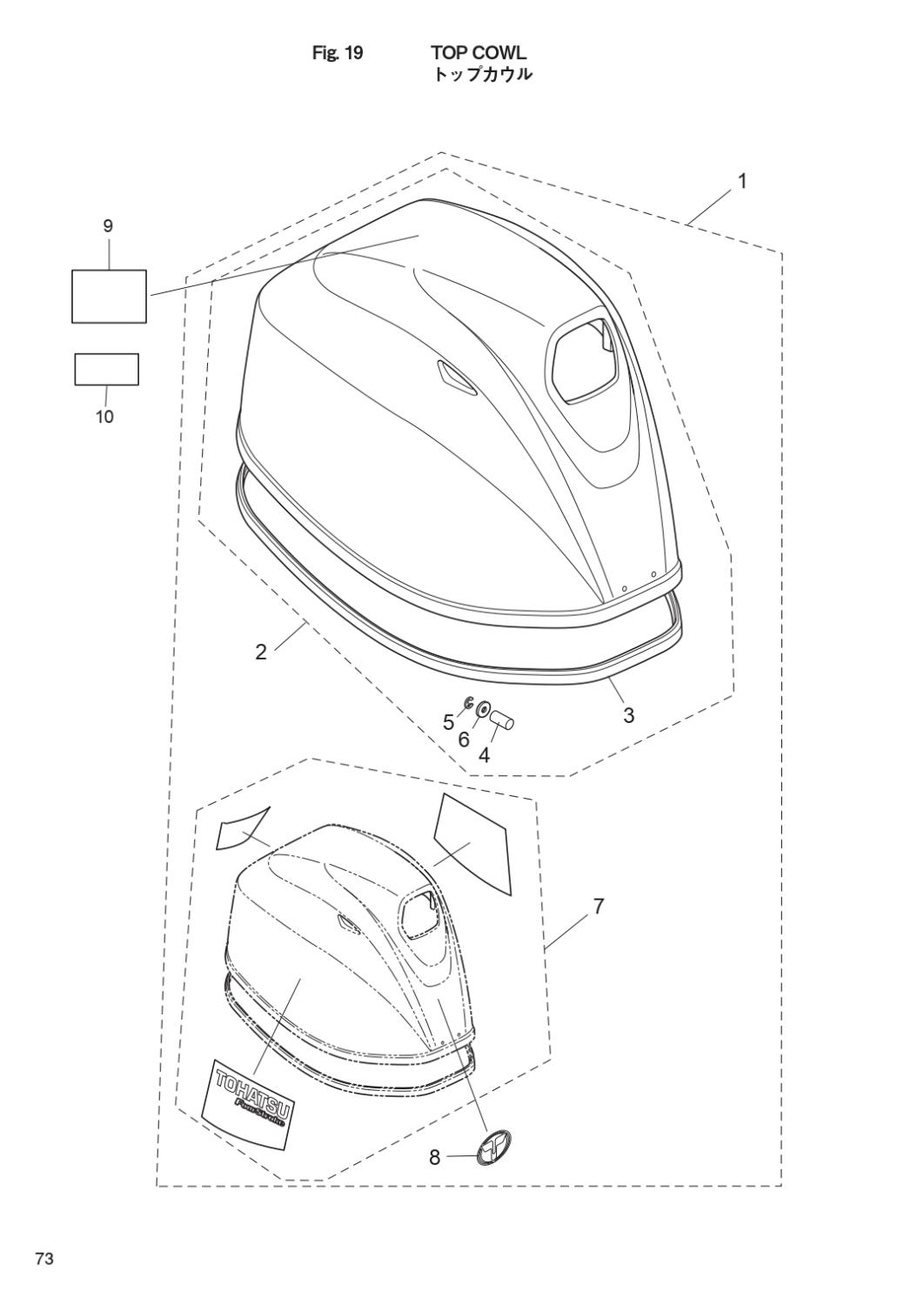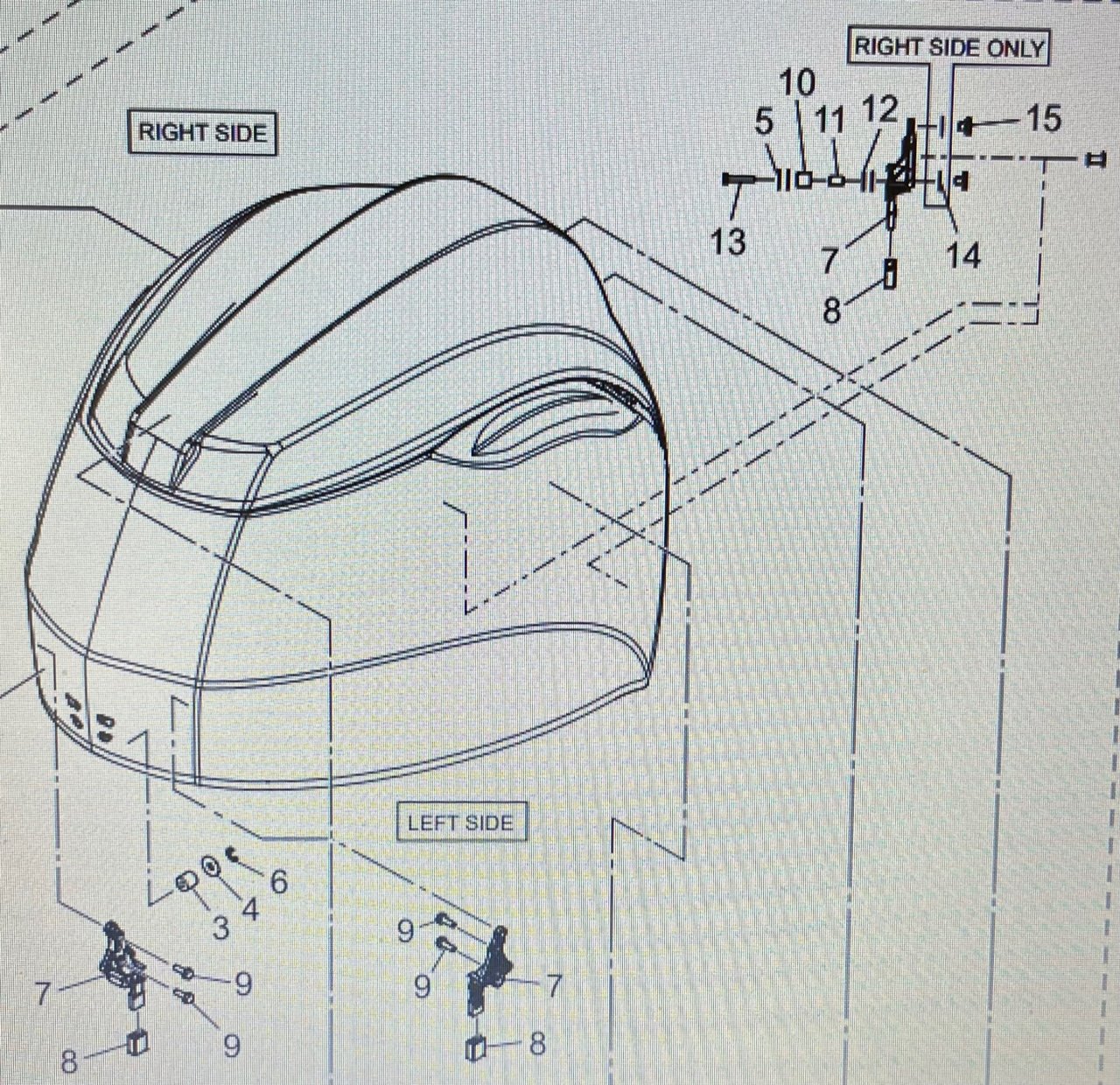 Rulle kåplås Tohatsu MFS 25 D - MFS 30 D bild 3, MFS 40 A - MFS 60 A, bild 1 och MFS 75 A - MFS 140 A, bild 2 4-taktare