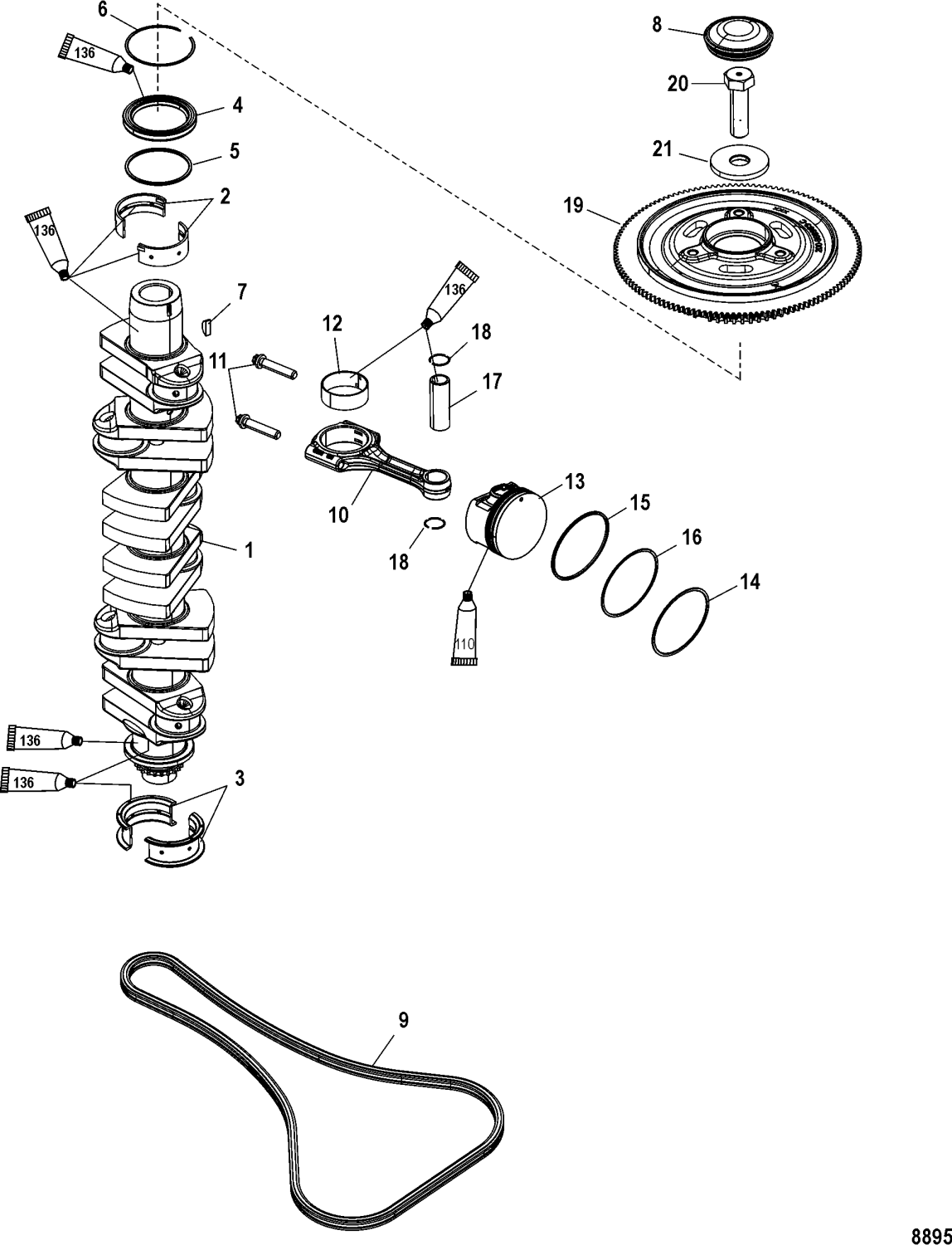 Svänghjulsbult Mercury Verado F 80 - F 115 hk, 2,1 liter, L 4 och L 6, samt F 75 - F 115 hk, 1,7 liter och F 150 hk, 3 liter, 4-takt